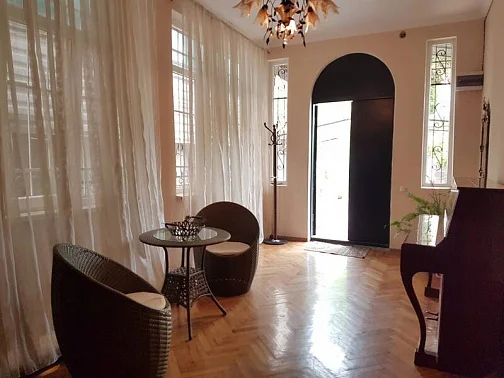 Особое достоинство дома - закрытый ухоженный внутренний двор, утопающий в цветах и декоративных растениях. Под виноградной беседкой оборудована зона отдыха со столом и лавочками - идеальное место для утреннего кофе или вечернего отдыха. На территории предусмотрена парковка для нескольких автомобилей.Дом расположен в престижной центральной части столицы. В пешей доступности - набережная, ботанический сад, Государственный краеведческий музей, филармония, обезьяний питомник, а также ключевые культурные и прогулочные маршруты города.