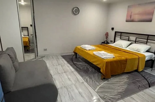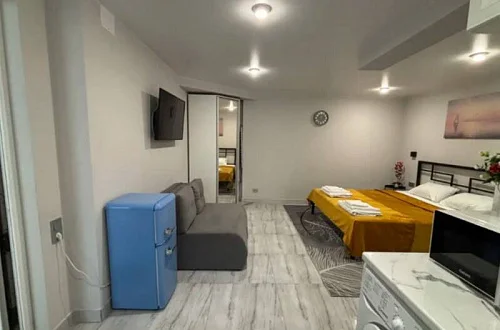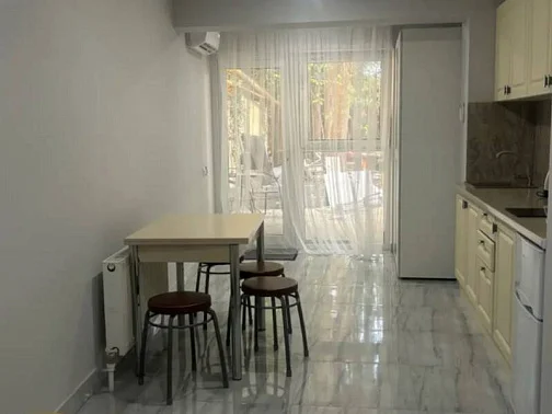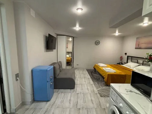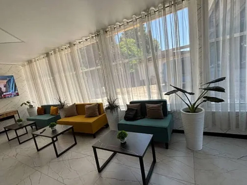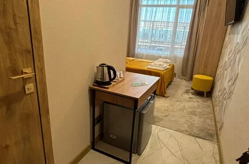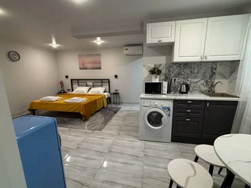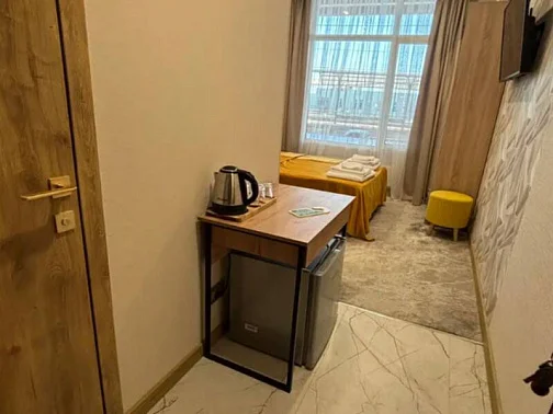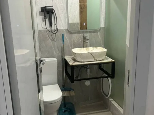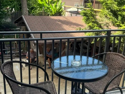 Отдохнуть можно во внутреннем дворике. На этаже есть гладильная доска с утюгом, на общей кухне есть стиральная машина для общего пользования (бесплатно). Работает Wi-Fi интернет. До парка, рынка, кафе и столовых дорога займет 5 минут.