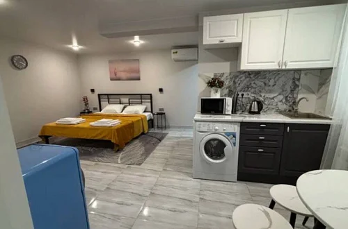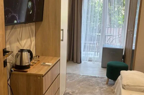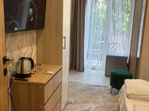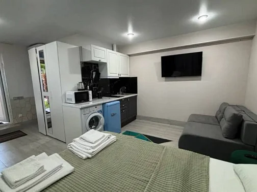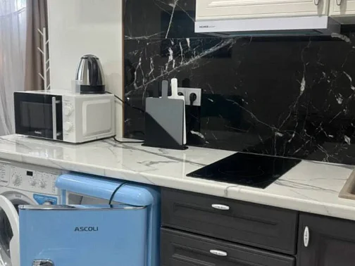 - кухня: Есть 2 номера с кухнями полноценные и есть 1 номер с кухней, но нет варочной панели, есть микроволновка.